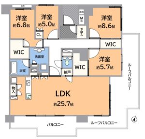 大きな魅力はバルコニー面積:14.08m2、ルーフバルコニー:34.61m2と