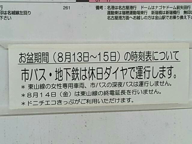 さて、お盆休みですが名古屋市営(地下鉄&バス)もお盆休期間中は写真の通り【休日ダイヤ】で運転されます。