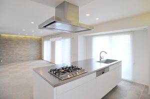 換気扇は天井吊り下げタイプ。アイランドをぐるりと囲んで作業ができるので