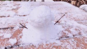 僅かな雪をかき集めて、雪だるまを作ってました…。