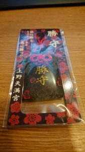 色は黒と赤の組み合わせで、内容は「勝」つためのお守りです。