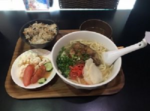 ソーキそばランチでスープ、サラダ、ジュース、炊き込みご飯が食べ放題。