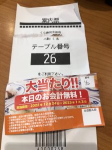 お店の人に聞いたところ、1日1組に当たるように当たり券は入れているとのこと。かなりのラッキーでした。
