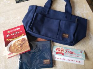 キャンパス風生地の大容量のトートバッグとポーチ、レトルトポークカレー、お食事補助券が2500円分ついて、2500円の福袋です。